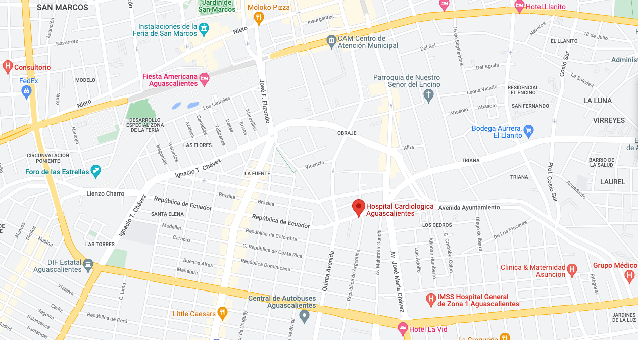 Hospital Cardiológica Aguascalientes, Ecuador 200, Las Américas, CP 20230 Aguascaientes, Ags. México.